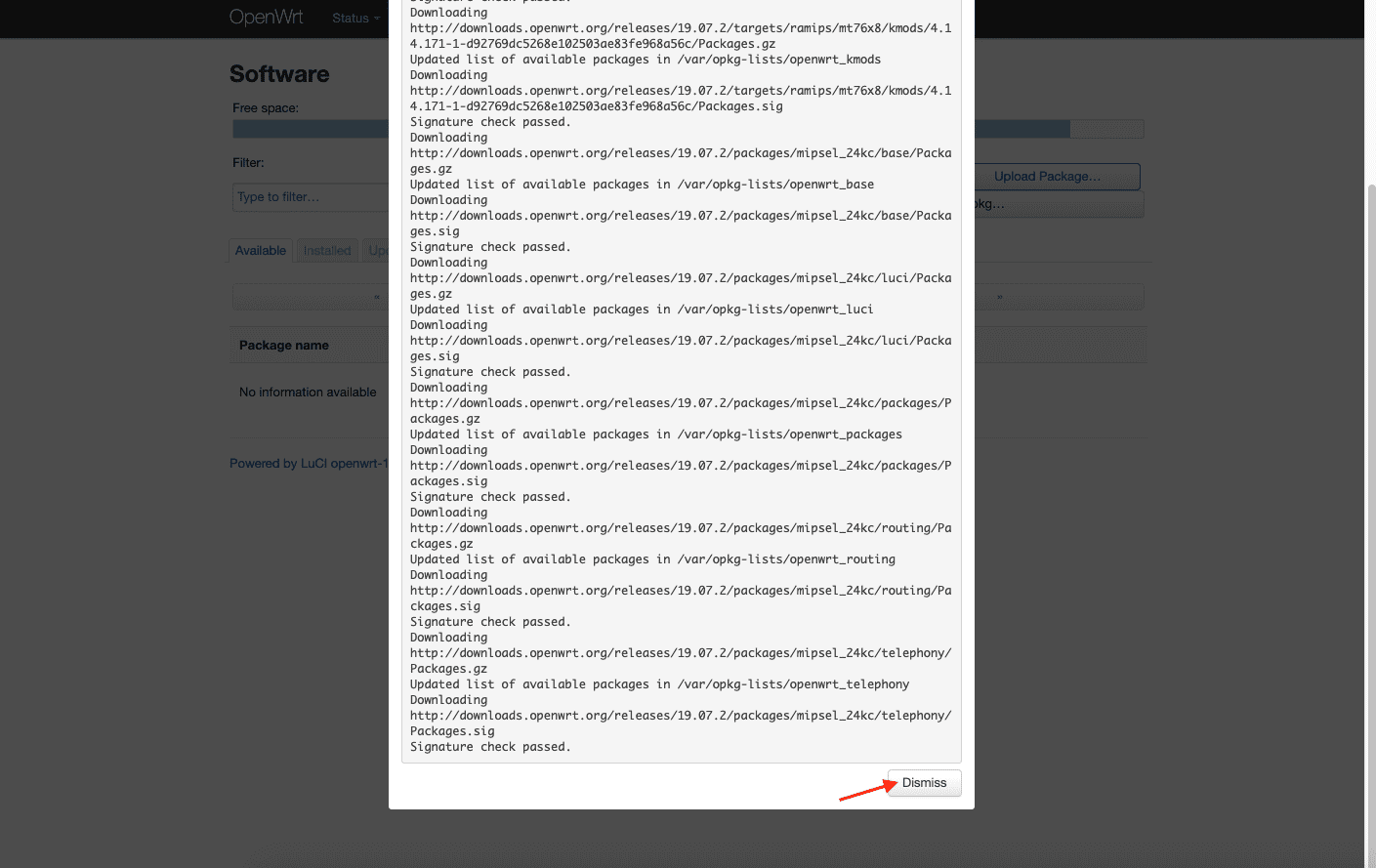2. Дождитесь завершения процесса и нажмите Dismiss.
