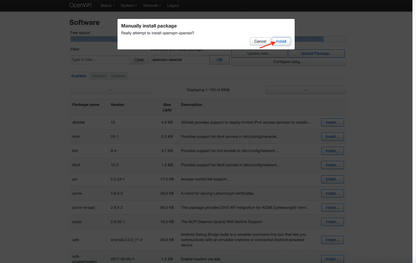 5. В поле Download and install package скопируйте luci-app-openvpn и нажмите Install.