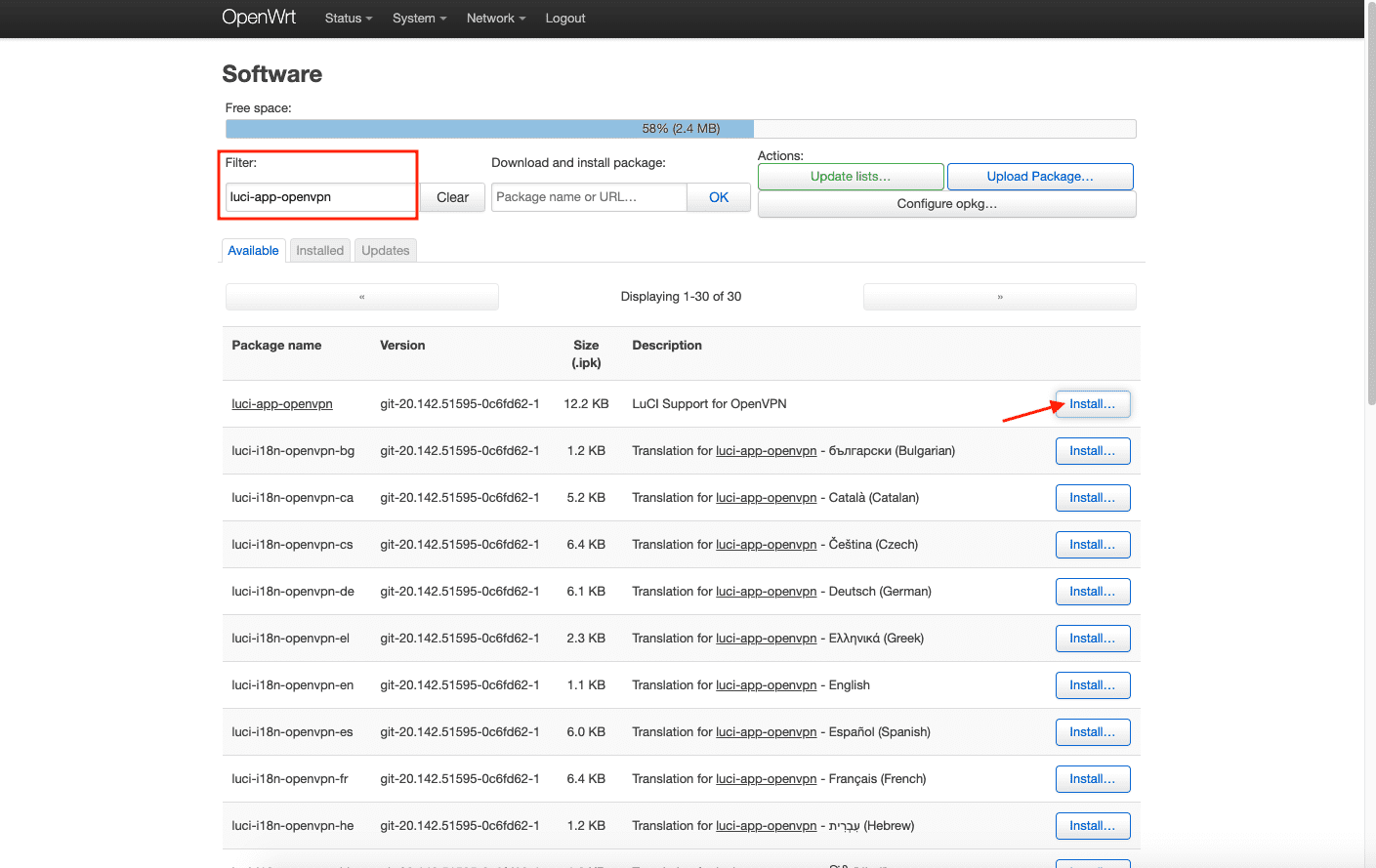 В поле Download and install package скопируйте luci-i18n-openvpn-en и нажмите Install.
