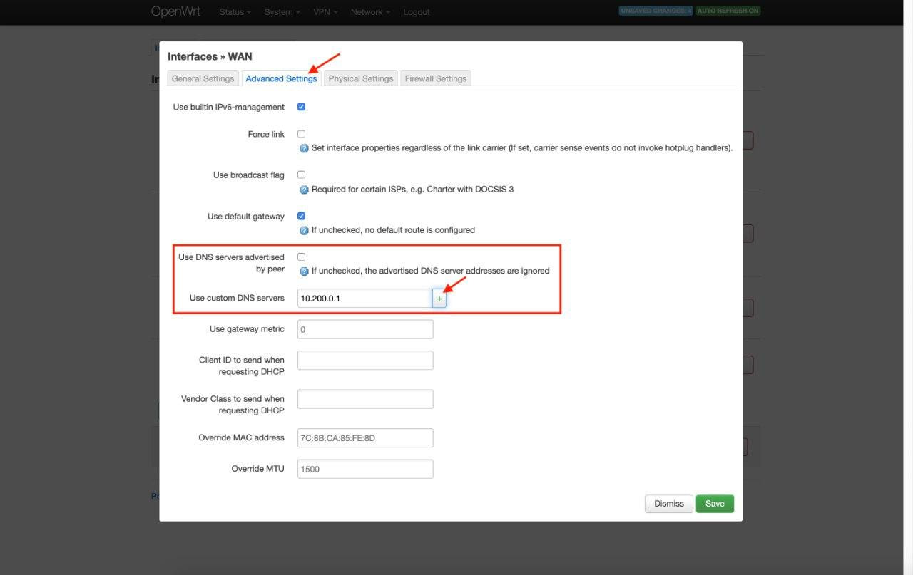 6. Откройте вкладку WAN > Edit > Advanced. Отключите параметр Use DNS servers advertised by peer, а для параметра Use custom DNS server установите значение 10.200.0.1. Нажмите +.