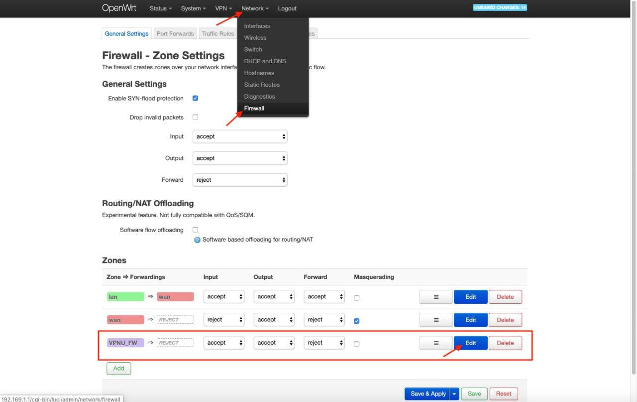 11. Перейдите на вкладку Network > Firewall и нажмите Edit справа от VPNU_FW.