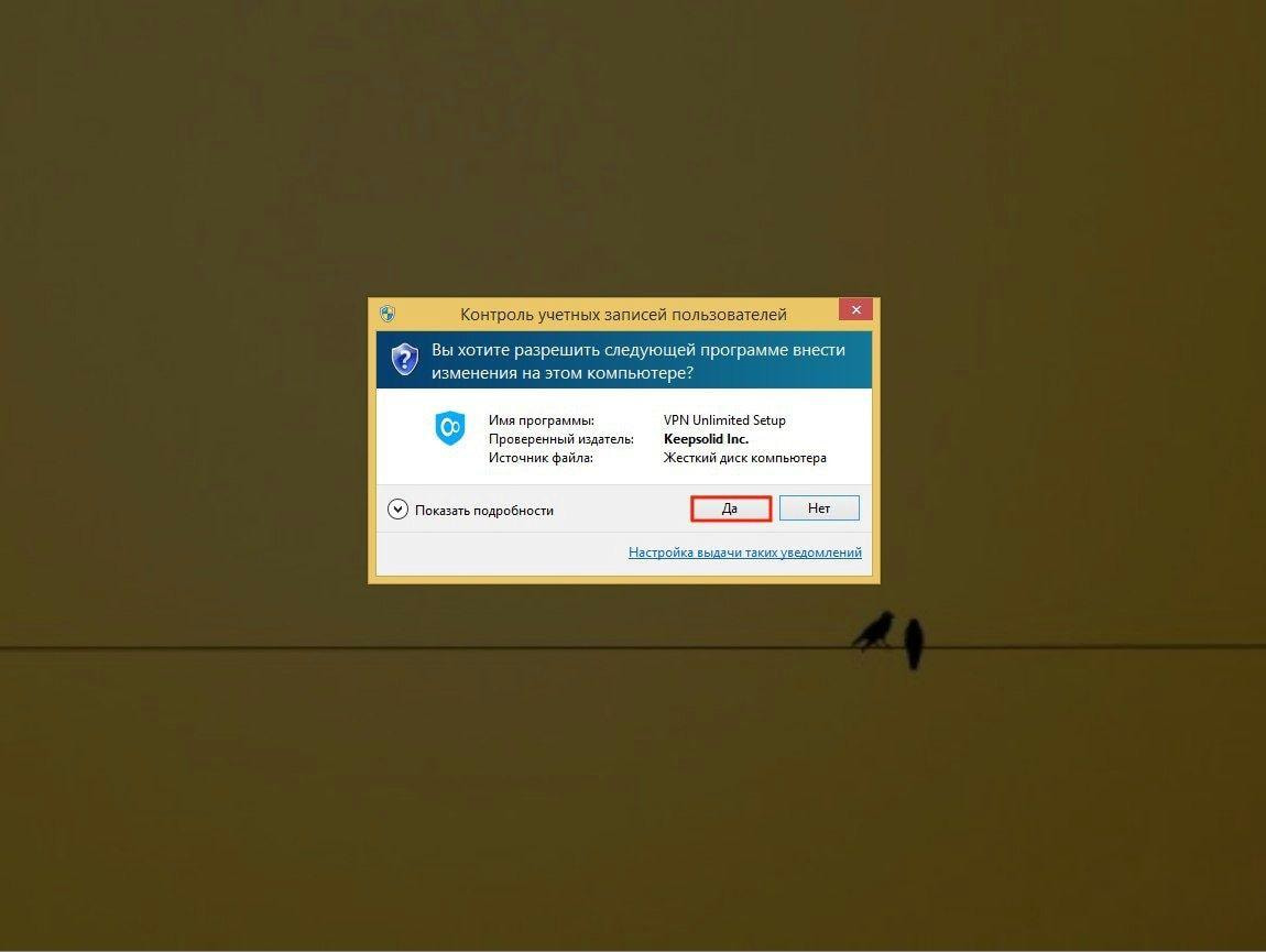 Чтобы продолжить установку VPN Unlimited, нажмите Yes.